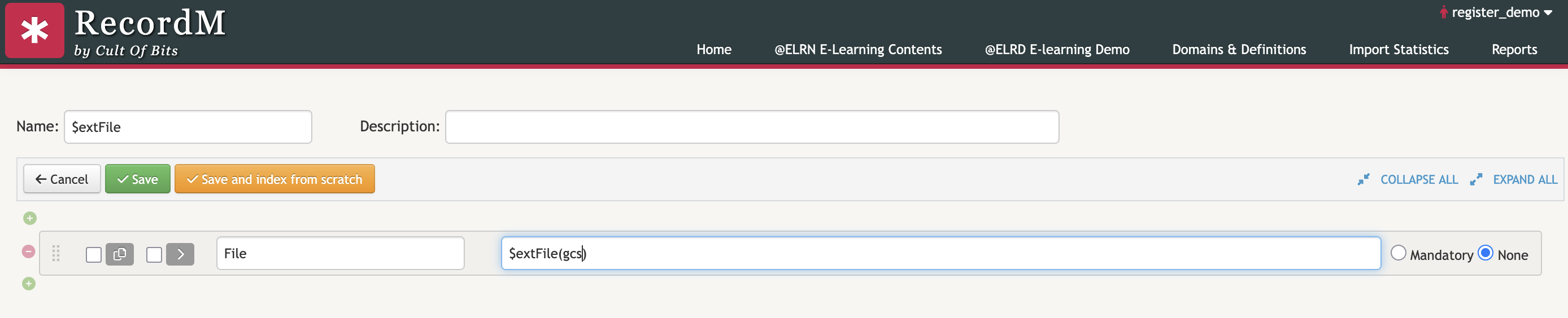 $extFile(<filestore label>)When using the $extFile(), you enable the integration of RecordM with an external file store for file management.