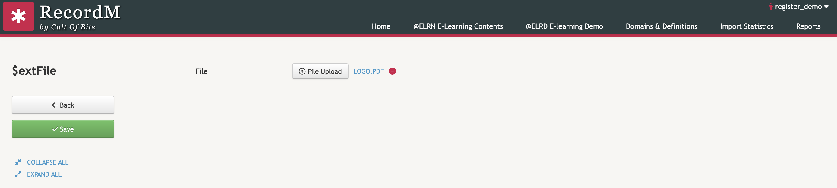 - When creating a new instance, any uploaded file is temporarily stored on the server. It will only be uploaded to the external file store when the instance is saved.