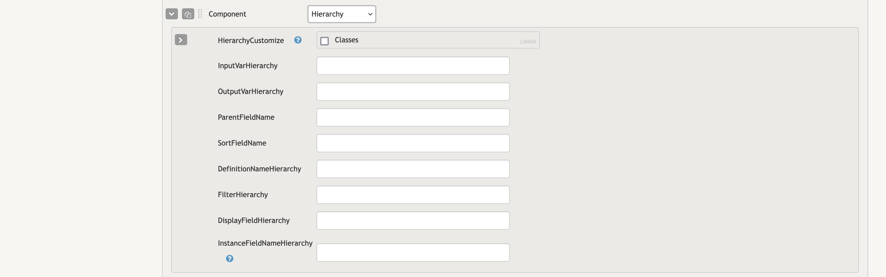 - InputVarHierarchy: Accepts an input variable that filters the results of the hierarchy. This input var is applied over the default filter (more below).