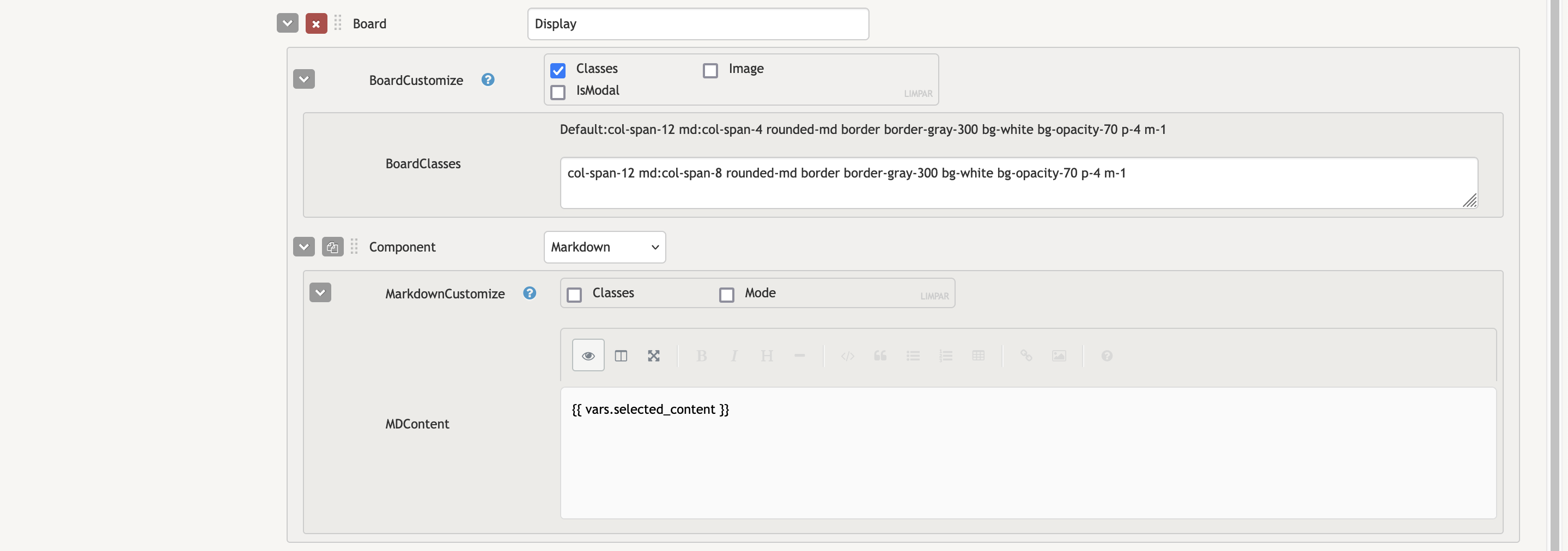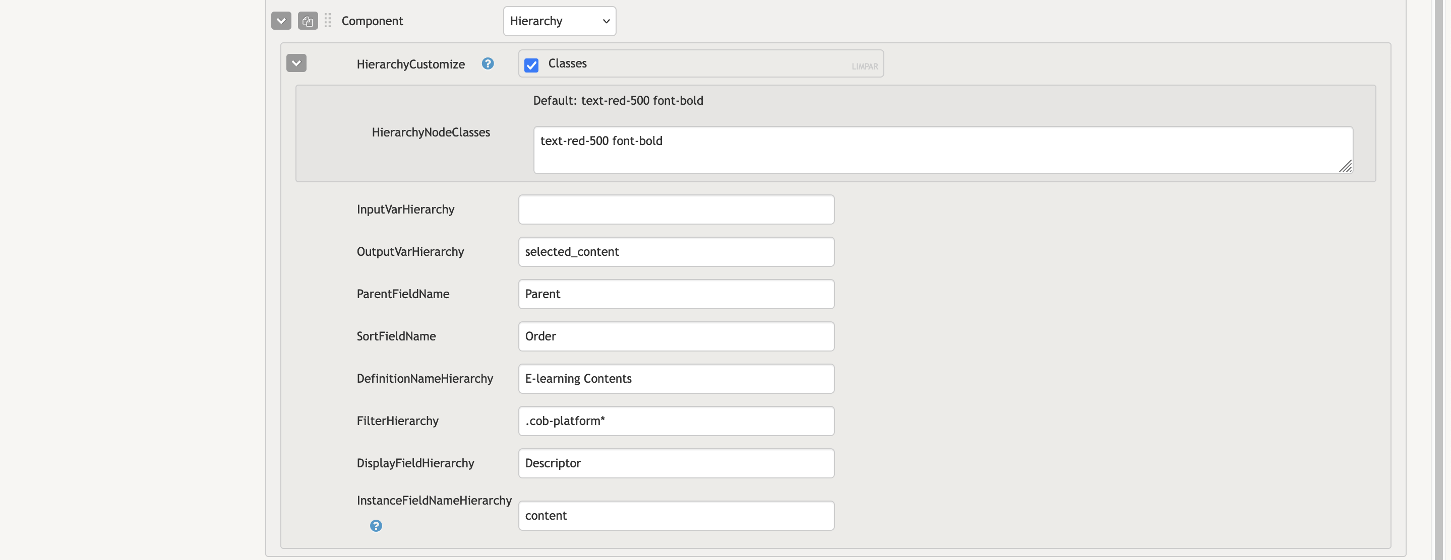 - HierarchyNodeClasses: Like in other components, this field accepts tailwind classes (or other classes) to customize the look of the component. Currently, these classes only apply to the selected element.